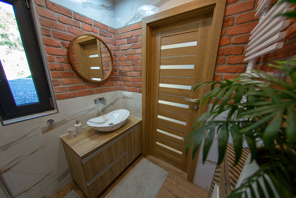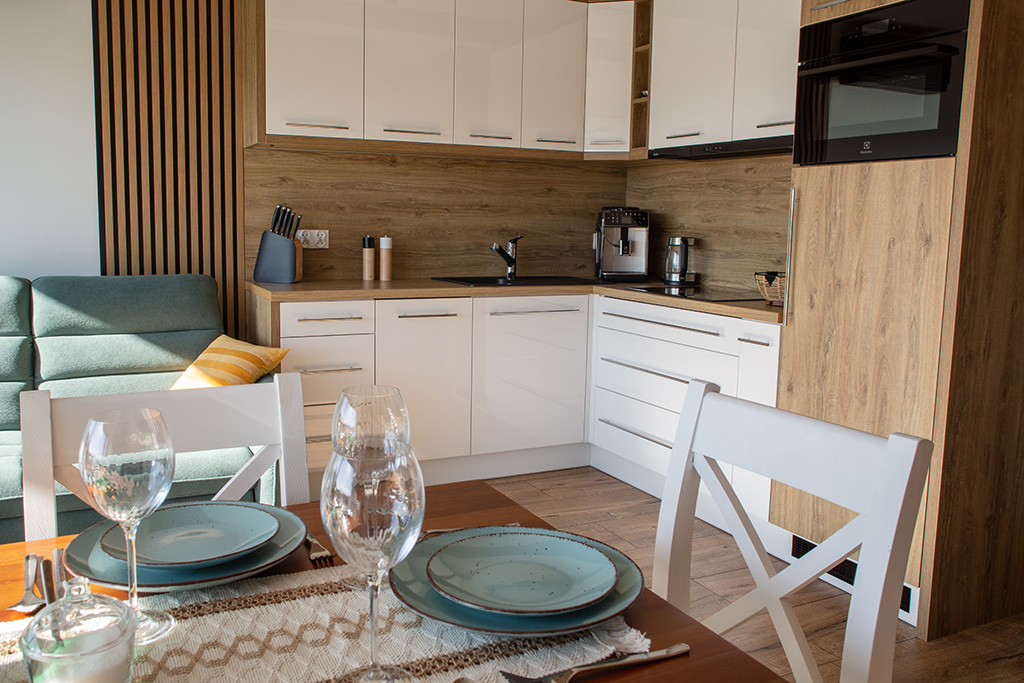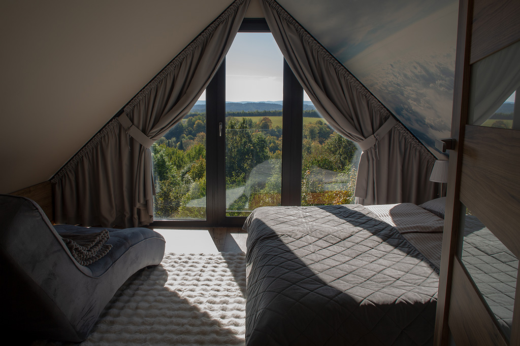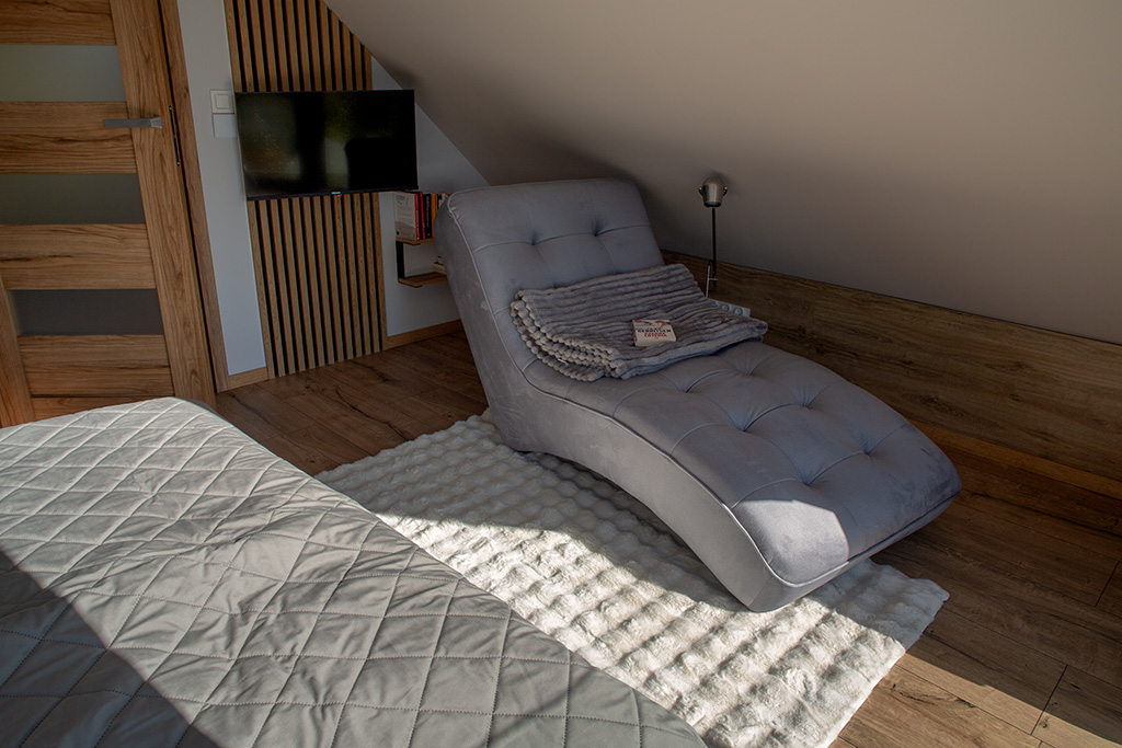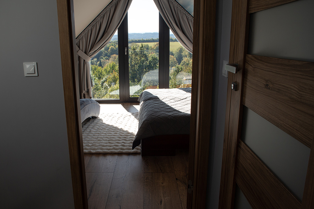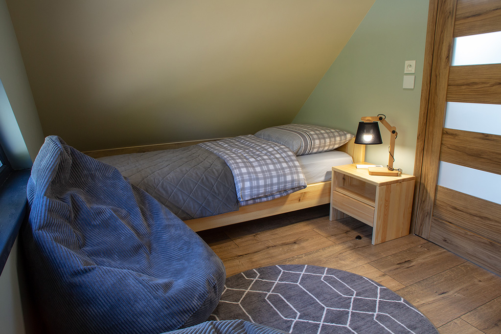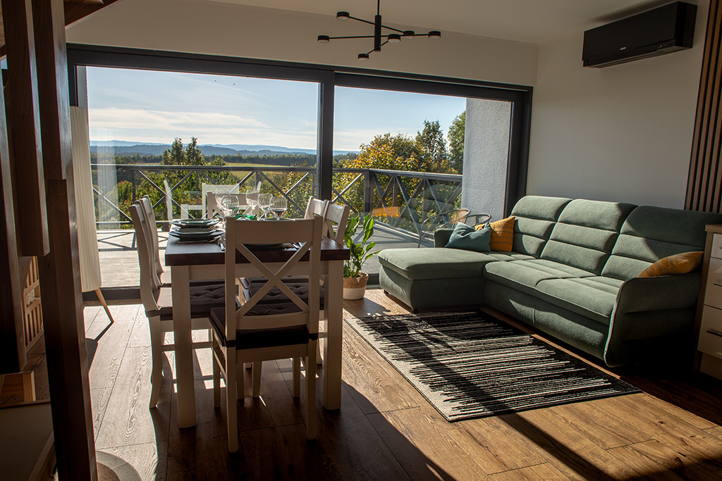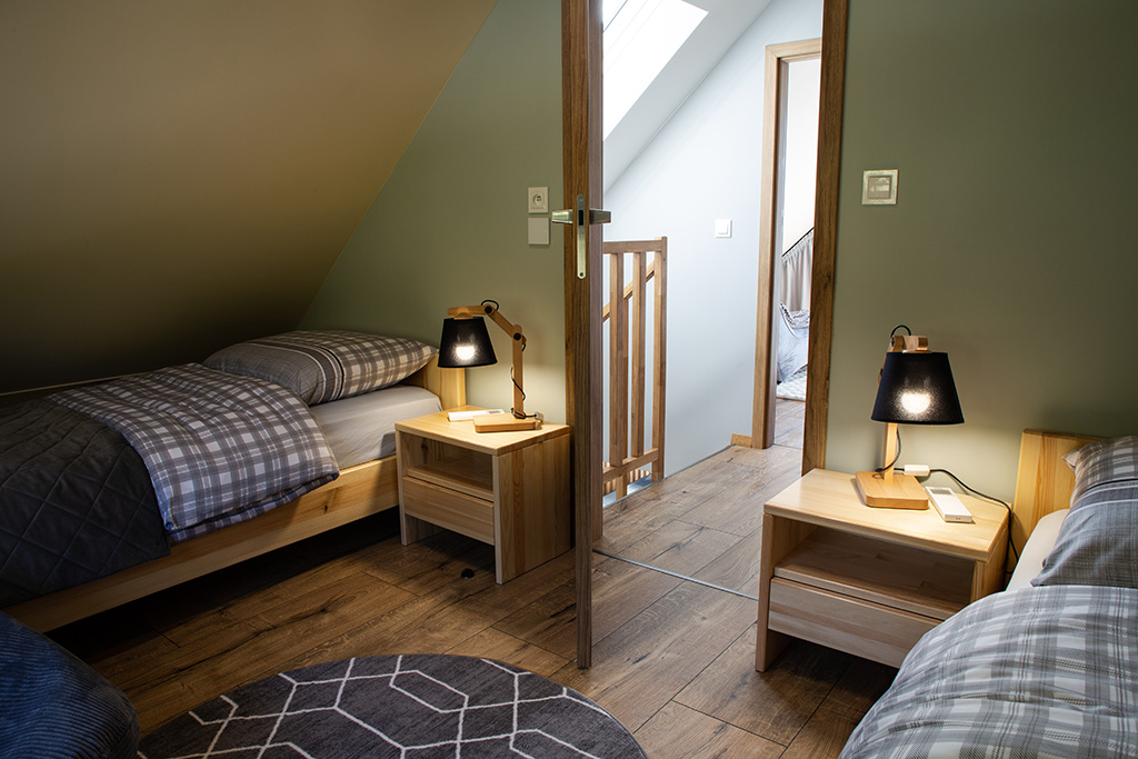 Domek Na Skarpie wśród zieleni z dala od miejskiego zgiełku z piękną panoramą na całe Karkonosze i Góry Izerskie. Obiekt składa się z dwóch sypialni, jedna z dużym łożem małżeńskim z panoramą na Karkonosze. Dodatkowo w sypialni znajduje się duży fotel przeznaczony do czytania lub relaksu i telewizor. Druga sypialnia posiada dwa duże wygodne łóżka. Na piętrze z sypialniami znajduje się także toaleta z umywalką. Zejście na parter odbywa się schodami. Na parterze domku znajduje się przestronny salon z w pełni wyposażonym aneksem kuchennym, w którym znajdziemy zlew, zmywarkę, dużą lodówkę, ekspres do kawy, kuchenkę. mikrofalówkę z piekarnikiem, czajnik oraz wszystko co niezbędne w kuchni. W salonie znajduje się przestronna rozkładana sofa, na której mogą spać dwie osoby. W pomieszczeniu jest także wyposażony kącik zabaw dla dzieci. Zajdziemy tu także stół z krzesłami dla sześciu osób, duży telewizor oraz duże panoramiczne okno z możliwością wyjścia na duży taras, z którego można podziwiać panoramę Karkonoszy. Na tym poziomie znajduje się także przestronna łazienka z prysznicem, toaletą i pralką,szuszarką do włosów. Każde pomieszczenie posiada klimatyzację i ogrzewanie podłogowe.